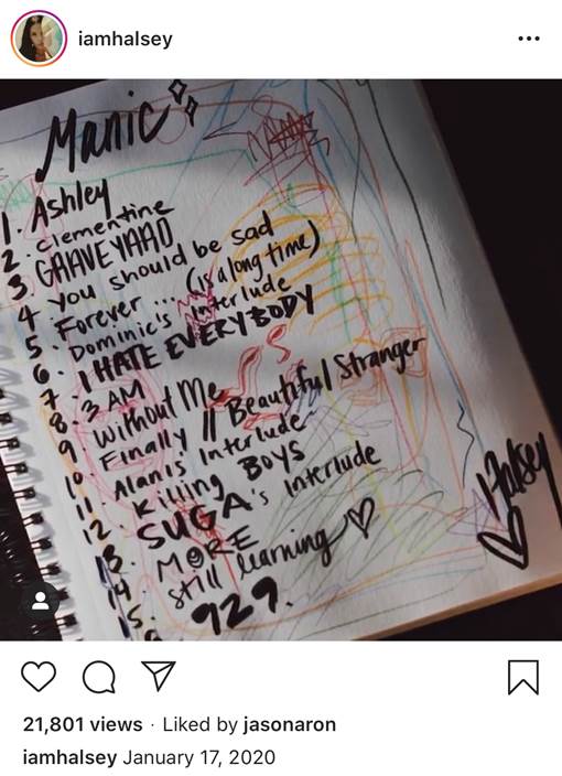 Halsey has taken her Instagram today to share with her fans a handwritten note revealing the track list of her upcoming album ‘Manic’ out January 17th.